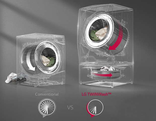 Le nuove lavatrici TWINWash di LG permettono di lavare due tipi diversi di bucato contemporaneamente, grazie al loro nuovo metodo di lavaggio con doppio cestello, rigorosamente in classe A+++. Questo nuovo prodotto di LG ha montato un motore 6 Motion Direct Drive con ben 10 anni di garanzia che lava proprio come le vostre mani. L’innovazione di LG è composta da una lavatrice a carica frontale con capacità di carico da 9KG a 12KG (in base al modello di lavatrice che si sceglie) e una mini-lavatrice a carica dall’alto con capacità di 2KG che si prende cura dei vostri capi più delicati.